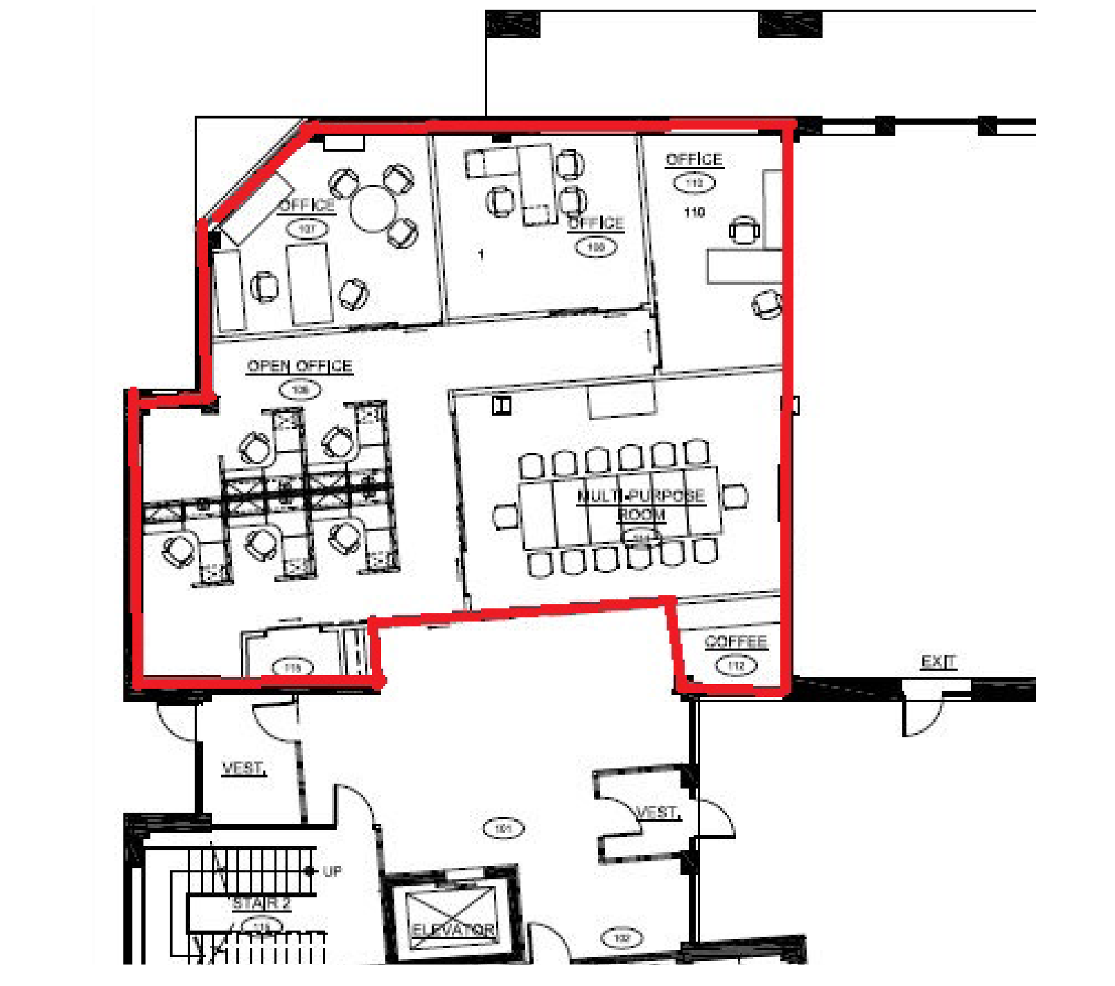 Suite 110: 2,266 s.f. on the ground floor featuring some open area, 3 private offices with windows, large boardroom and kitchenette.