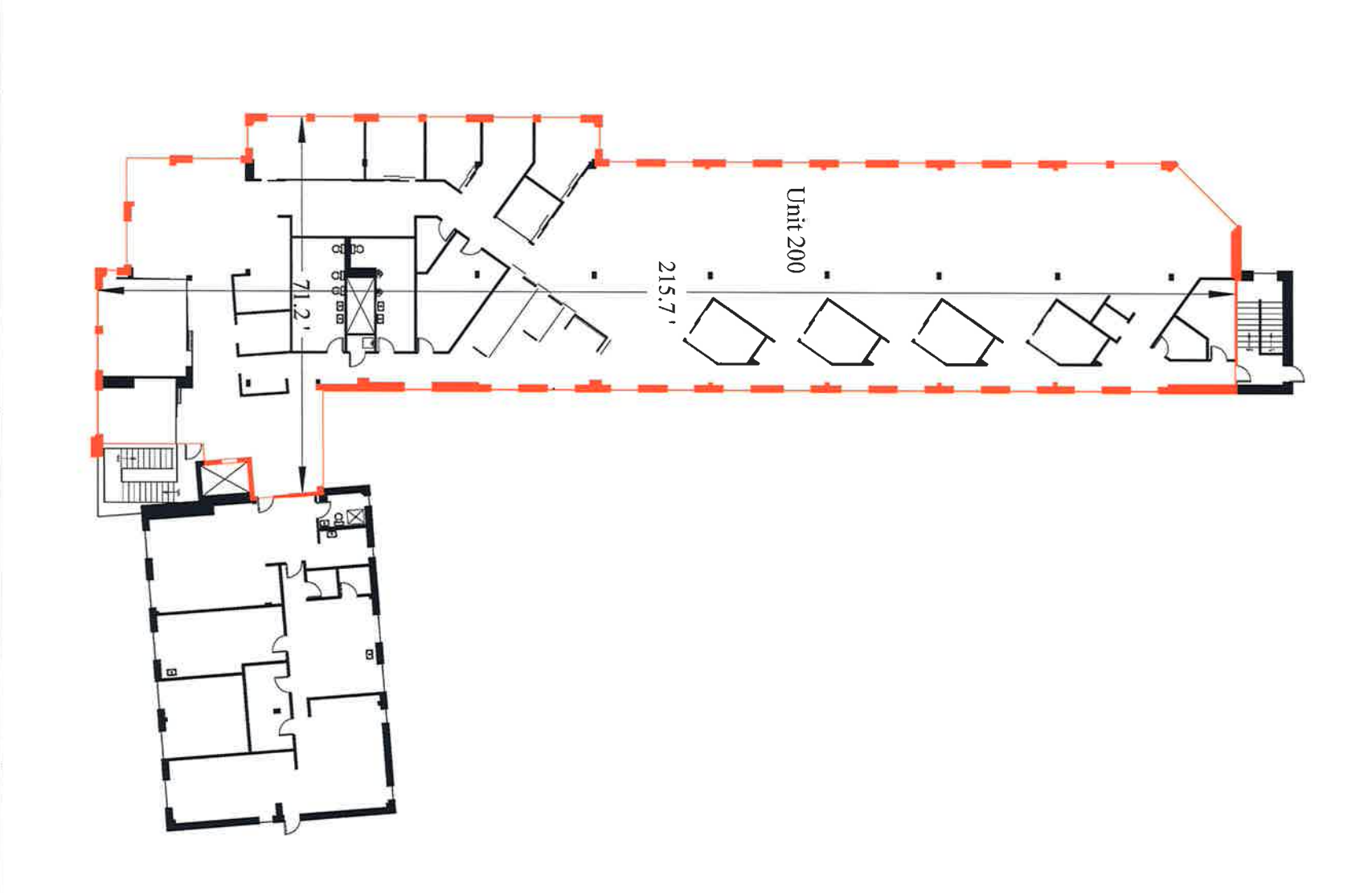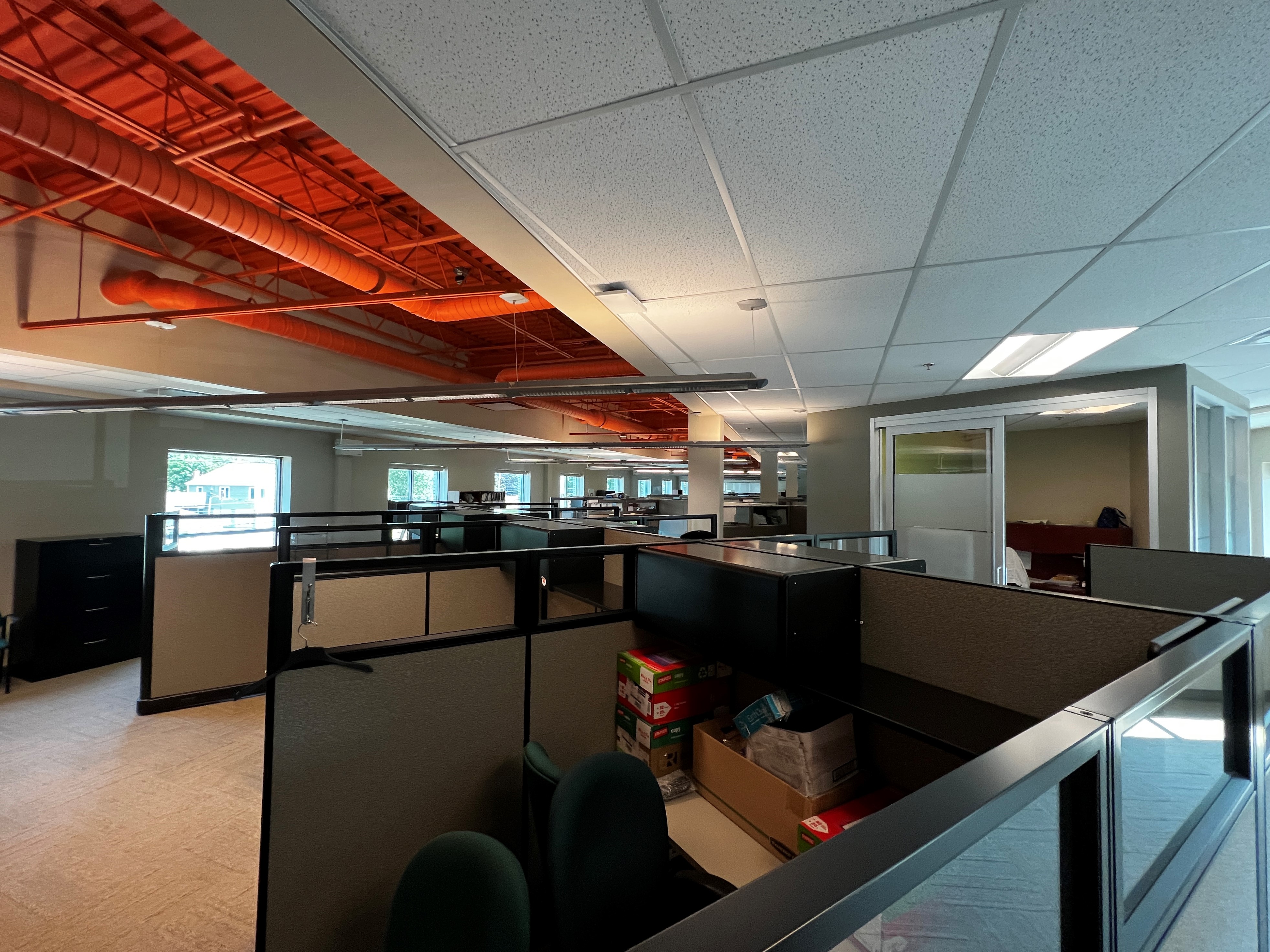 Suite 200: 10,509 square feet of finished office space on the second floor. Reception, large open area for work stations, 7+ private offices, several meeting rooms and kitchen. Tons of natural light!