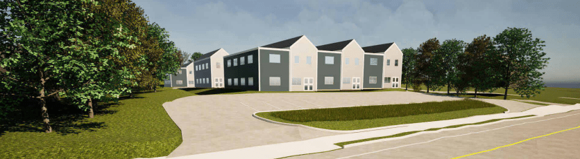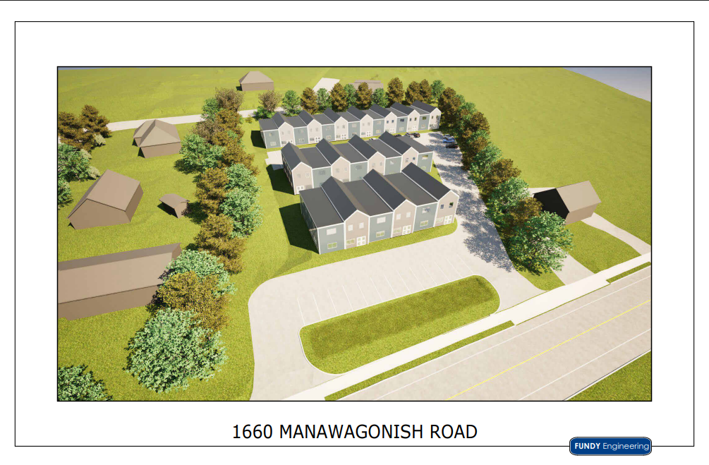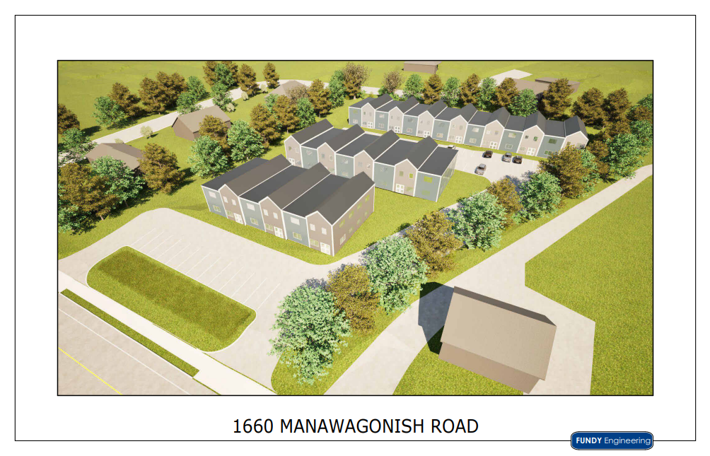 Site plan and artist rendering showing potential for up to 56 townhouse style units on this in-fill development lot on Manawagonish Road in west Saint John.